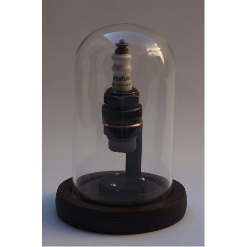 If you think the first two were impressive, take a look at our imposing new M-60 SUPERDOME. The glass dome* measures a whopping 150 x 100mm, with a solid Oak base (120 x 20mm), finished in luxury Osmo oil and a high-quality wax polish finish (it's worth buying just for the smell...). This time, the spark plug is accompanied inside the dome by its original box (also mounted on a custom 3D printed stand) and a small frame bearing a copy of the wax paper wrapping on the front (see above), and on the back two miniature reproductions of original press and outdoor advertising for Firestone Polonium spark plugs, dating from the 1940s.